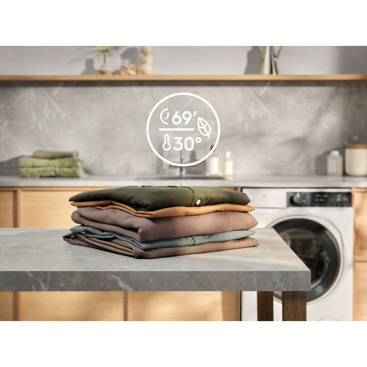 *Com base em teste interno de tempo, água e consumo energético de uma carga de 1 kg, em comparação com carga máxima no ciclo Algodão a 30°C usando SensiCare+, que ajusta o programa de acordo com o tamanho da carga.