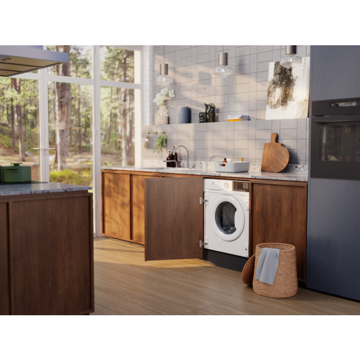 Máquina de lavar roupa de encastre 8 Kg e 1.400 rpm, com Tecnologia SteamCare para refrescar e desenrugar roupa seca ou molhada, Tecnologia SensiCare para adequar os ciclos à carga, programa Antialérgico com vapor 60ºC, SoftPlus para melhorar a distribuição do amaciador, Time Manager, Painel Branco e Óculo Branco