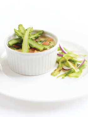 4. Unte 6 forminhas de loiça ou de vidro, divida os espargos e os tomates entre elas e deite a mistura dos ovos e leite.