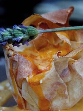 2. Corte cada folha de massa filo em quatro. Forre forminhas de alumínio (tipo queque) com dois destes retângulos. Em cada forma, coloque uma colher de massa de pão-de-ló. Leve ao forno durante aproximadamente 8 minutos a 200º.