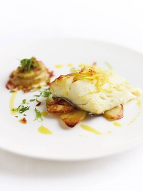 4. Cubra o fundo com uma camada de rodelas de batatas. Coloque o bacalhau por cima. Espalhe o resto das batatas à volta do prato.